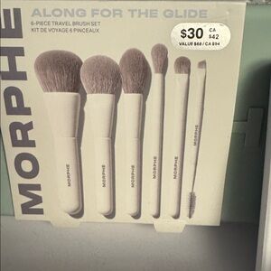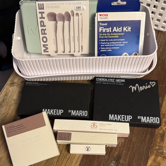 Makeup collection featuring Makeup by Mario palettes and assorted boxed cosmetics. Includes light beige and cream packaged items and a Morphe brush set. Great neutral-toned makeup assortment. Clean presentation. Ready to style your beauty routine.