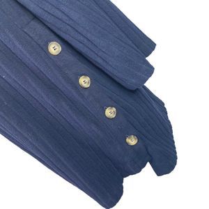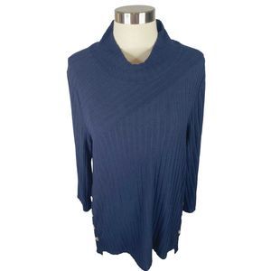 Navy mock neck tunic, ribbed asymmetrical raised pattern/texture, side accent buttons, long sleeves, pullover style