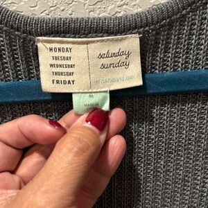 Gray knit midi dress with belt. 50% recycled polyester 25% acrylic 19% nylon 6% wool