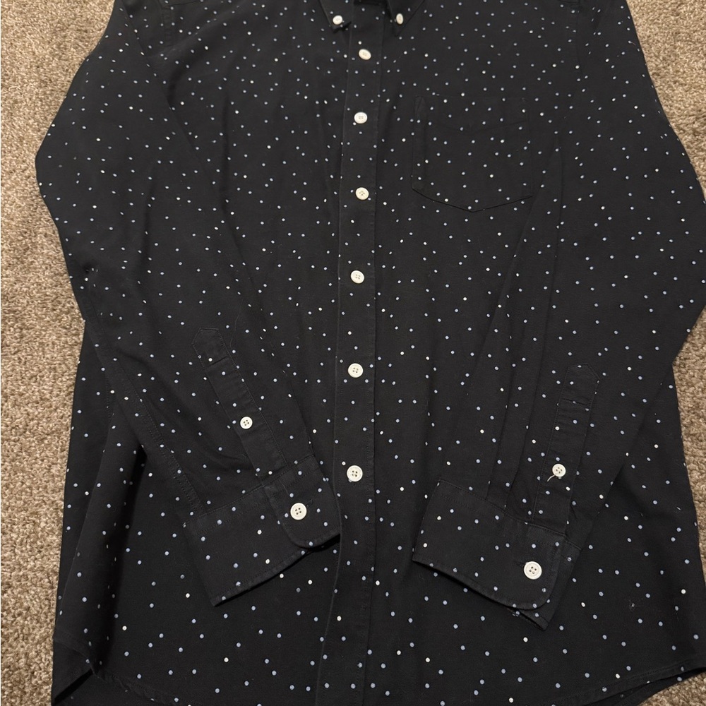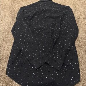 Stylish black shirt with white polka dots. Features button-up front and cuffs. Perfect for casual or formal occasions.