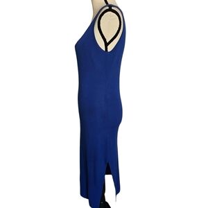 This elegant blue sleeveless Pullover dress is perfect for any occasion. Its sleek design offers a flattering fit, making it a versatile addition to your wardrobe. Slit on one side. 82% Viscose 18% Nylon. Armpit to Armpit 19in Waist 34in Length 43in