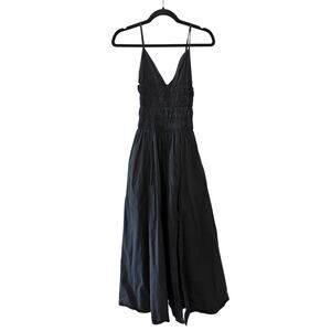 Sau Lee Brielle Midi Dress in Black. Women's Size US 4 / Small. Features a v-neckline, sleeveless design, smocked bodice for a flattering fit, and a flowing midi to maxi length skirt with a side slit. Made in 100% cotton poplin for a lightweight feel. Some wash wear / fading. Retail $495.