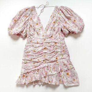 Topped with voluminous puff sleeves and finished with ruching and ruffles, this Sau Lee mini dress brings the (romantic) drama from head to hemline.