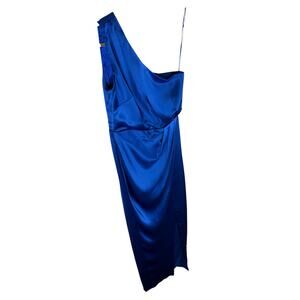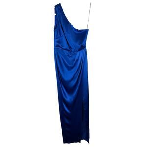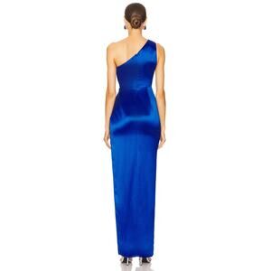 The Sau Lee Preston Satin Maxi Dress in Egyptian Blue is a stunning and elegant piece, featuring a chic one-shoulder design and a high slit for added allure.