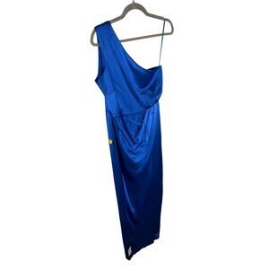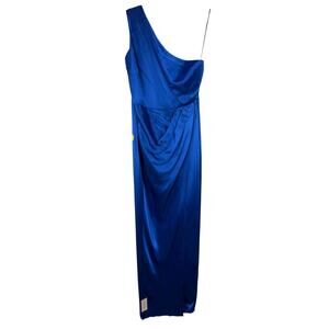 The Sau Lee Preston Satin Maxi Dress in Egyptian Blue is a stunning and elegant piece, featuring a chic one-shoulder design and a high slit for added allure.