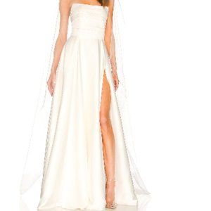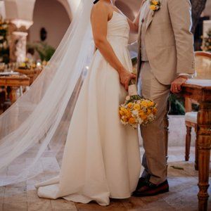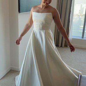Fully lined. Boned bodice with pleated detail side seam slit. Heavy-weight satin fabric with side seam pocket. Neckline to hem measures approx 51 inches.
