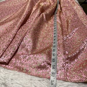 SO STUNNING and in excellent preowned condition! Pink floral printed jacquard (Shell: 100% Polyester, Lining: 100% Rayon). Gown. Sleeveless. V-neckline. Hidden center back zipper with hook-and-eye closure. Partially lined. Side pockets.