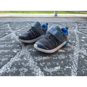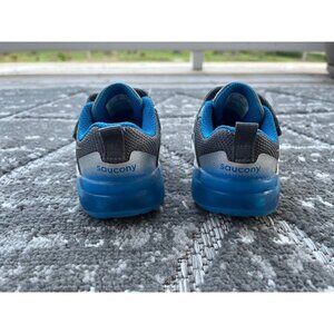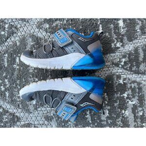Saucony brand baby shoes, size 6W. Good condition but does have signs of wear. Has button on shoes to light them up but only the right one still lights up. Lots of life left.
