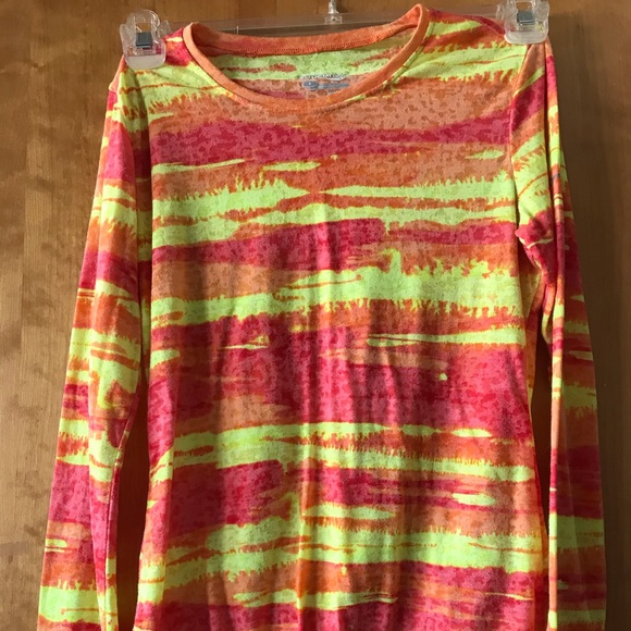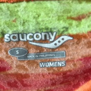 Beautiful sunset colored base layer top from Saucony. Has thumb holes at the wrists for extra comfort.