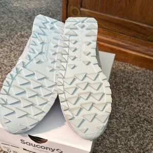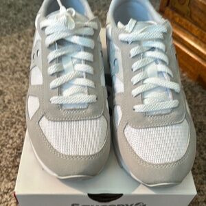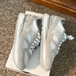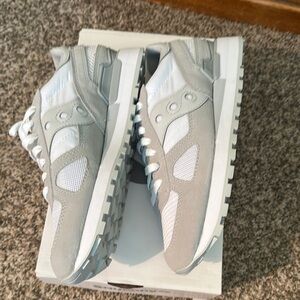 Sleek Saucony trainers in white and gray. Ideal for everyday comfort.