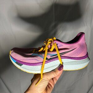 Colorful and fun saucony endorphin pro running shoes. So much tread left on these sneakers, They are extremely lightweight while still having so much cushion. One small knick shown in the pictures. I got into a car accident after buying these and couldn't run anymore so I hope they go to a good home because I loved them