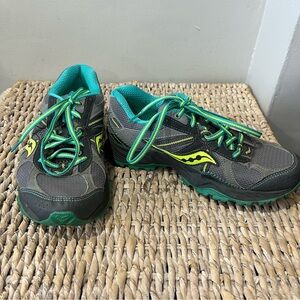 Hiking Trail Running Shoes in size US 7. These teal, yellow, and gray shoes feature a colorblock pattern with the Saucony logo accents. Designed for cross training and hiking, they offer moderate cushioning and arch support. Perfect for active wear in all seasons, these comfortable and breathable shoes have a low top shaft style and a durable rubber outsole for trail running.