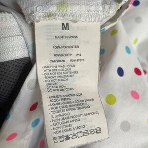Lightweight jacket for running, walking, general outdoor adventures. EUC. Visible, reflective strips, water resistant. Women's size M. White background with multi-color dots. From my personal collection, washed and stored carefully in my non-smoking, Labradoodle loving home.