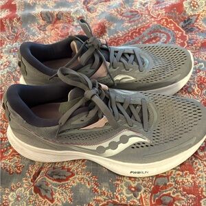 Stylish Saucony athletic shoes. Gray with pink accents. Ideal for running and workouts.