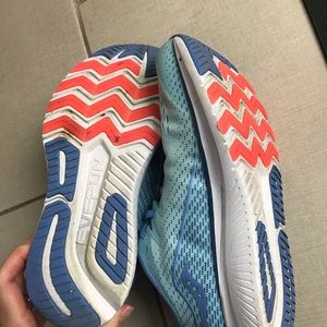 Saucony ride in good used condition. About 40-50 miles on them. Size 9 wide (women).