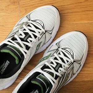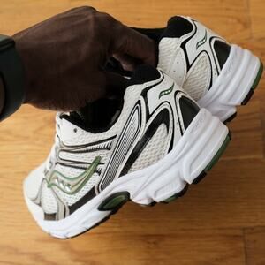 Saucony Ride Millennium sneakers in white, green, and black, size US men's 7.5 (unisex). Classic Y2K-inspired running shoe with breathable mesh uppers, metallic overlays, and Saucony’s Grid cushioning system for support. Lightweight design with padded collar and tongue for comfort, making them perfect for everyday wear, running, or styling with casual fits. Timeless sporty aesthetic that works for both streetwear and performance.
