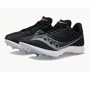 The Saucony Velocity MP Men's Mid-Distance Track Shoes/Spikes in Black Vizi Size 14 are designed for athletes seeking high performance in track and field events. These shoes feature a low top shaft style with a lace-up closure, making them ideal for active wear. The spikes on the shoe provide added traction, perfect for mid-distance running. With a sleek black color and a metal cleat type, these athletic sneakers from Saucony are a stylish and functional choice for competitive sports.
