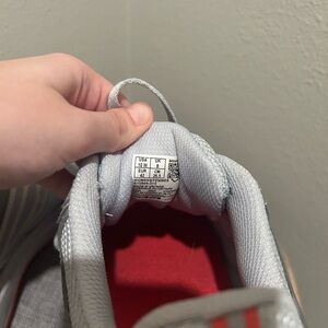 Light gray athletic shoes with pink accents. Sleek design for active wear. Comfortable and stylish.