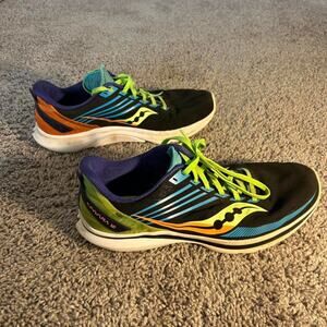 Saucony Kinvara 12 running shoe in a black, blue, yellow, and orange colorway. Men’s size 10.5