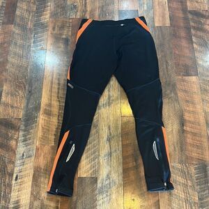 Great athletic leggings with reflective strips on the lower leg. Zippered lower legs.