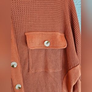 Elevate your wardrobe with this stunning Saukole orange long line over shirt. Featuring a collared neckline, button front closure, casual sleeves, and front pockets embellished with buttons, this piece is perfect for travel, casual outings, and workwear. The waffled pattern of the flannel like fabric, made from a polyester and cotton blend, adds a touch of texture to the shirt, making it a stylish and comfortable addition to your wardrobe