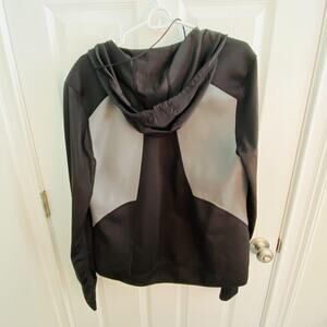 Jacket features: Hood with drawcord, full front zipper, zip hand pockets with reflective trim; performance sauna/sweat design.