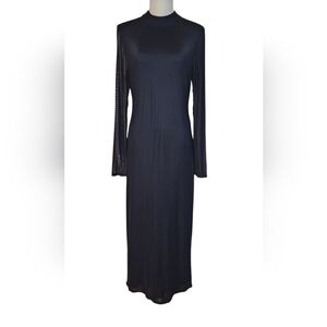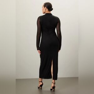 Black mesh (97% Recycled Polyester, 3% Spandex). Sheath. Long sleeves. Mock neck. Back zipper closure. 54" from shoulder to hemline. 17.5" slit. Imported.