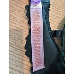 The Savage Not Sorry Lightly Lined Lace Balconette Bra in Underworld Green features lightly padded cups, a straight low-cut neckline, and underwire support for a flattering lift. The stretch lace design is sexy yet comfortable, with a rose gold-tone X charm for a stylish touch. Adjustable straps and a hook-and-eye back closure ensure a perfect fit. Made from 86% nylon and 14% elastane. Brand-new with tags.