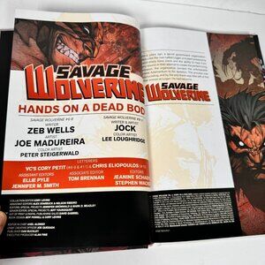The product is a single unit comic book titled "Savage Wolverine Hands on a Dead Body Vol 2" by Marvel Enterprises. Written by Zeb Wells and illustrated by Jock, with a cover by Joe Madureira, this modern-age US comic is part of the Savage Wolverine series. Published in 2014, this first printing in hardcover format is in English and features colorful artwork. Intended for a general audience, this superhero adventure comic is a collectible item for fans of the genre.