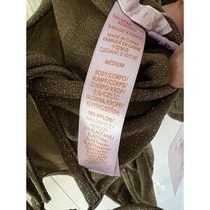 Elevate your lingerie game with this stunning green Savage X Fenty bodysuit. This one-piece bodysuit features a strappy design with a mock neck and a slimming effect that will make you feel confident and sexy. Made with a blend of nylon, spandex, metallic fiber, and cotton, this lightweight bodysuit is perfect for a night out or a special occasion.