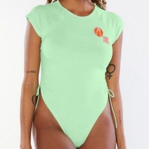 light, mint green thong body suit with shirt sleeves