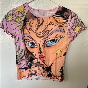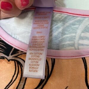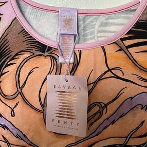 Embrace a bold look with this Savage X Fenty crop tee, featuring a striking graphic design in pink and blue hues. The short sleeves and fitted style make it a perfect choice for a trendy, casual outfit. The eye-catching artwork on the front adds a dynamic touch to your wardrobe. Wash before wear