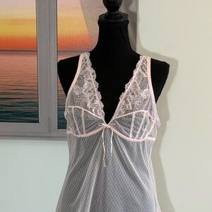Indulge in the romantic allure of this Savage X Fenty chemise, crafted in a soft pink and white palette. Featuring a plunging V-neckline with delicate lace detailing and thin shoulder straps, this piece offers a semi-sheer mesh fabric with a flowy, loose fit for ultimate comfort. The elegant lace trim along the bust adds a touch of sophistication to this intimate sleepwear essential.