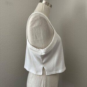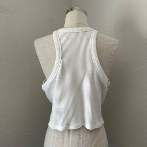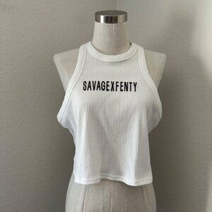 Savage X Fenty ribbed crop tank top. Pullover construction, high neck, front logo graphic print in black, sides slit and racer back style. Noted two small stains showing on last two pictures for reference.