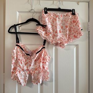 Chic pajama set with floral patterns. Features ruffled edges and adjustable straps. Perfect for a cozy night in.