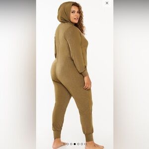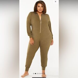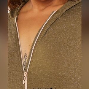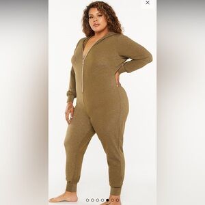 Savage X Fenty Sleep & Shine Hooded Onesie in Olive Green. Hooded long sleeve stretchy jumpsuit. Zipper up the front. Glittery olive green fabric. Like new. Size 1X. (Model is wearing a 2X for reference).