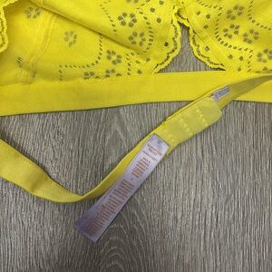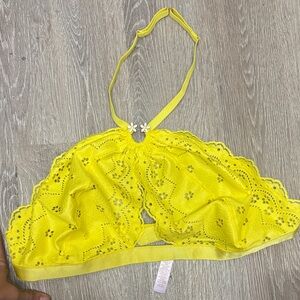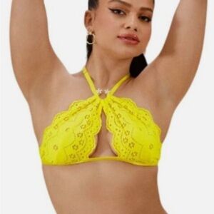 Bright yellow lace bralette with floral accents. Features a halter neck design.