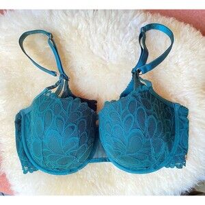 New without tags. This Savage X Fenty balconette bra features custom-designed stretch floral lace in a rich green shade. Lightly lined with underwire support for a flattering shape and lift. Signature rose gold-tone X charm at the center front adds a luxe touch. Adjustable straps and hook-and-eye closure ensure a perfect fit.