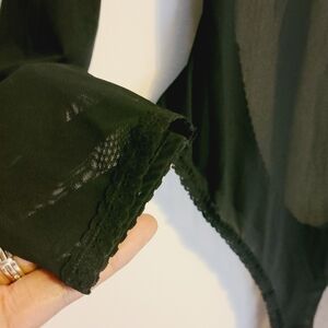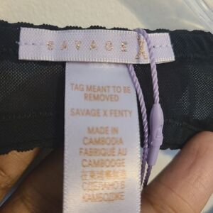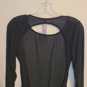 For a cozy night in. Women's black, soft mesh, long sleeve, sheer, scoop neck, open back teddy or bodysuit by Savage X, size XL. High leg thong. sheer soft mesh with lace trim. Minimal coverage. Metal logo plate at hip. Bodysuit is backless and is new with tags; no flaws.