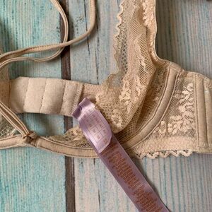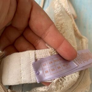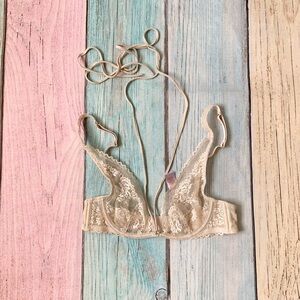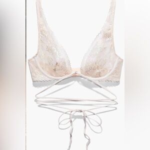 Savage x fenty women’s cage lace unlined bra with tie 32A. In like new condition. No signs of wear. Color is a cream with some iridescent color in the back. Cup part is see-through lace. Has under wire.
