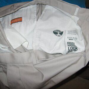You are considering a pair of Savane ecco-Start pleated dress khakis. Size tag cut out by previous owner, but they are size 40 x 29. Hidden elastic waistband makes these very comfortable to wear and conducive to most body types. 58/40/2 Cotton/Polyester/Elastane construction.