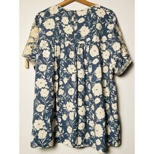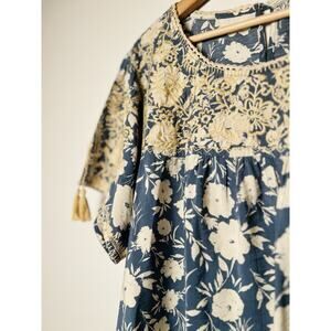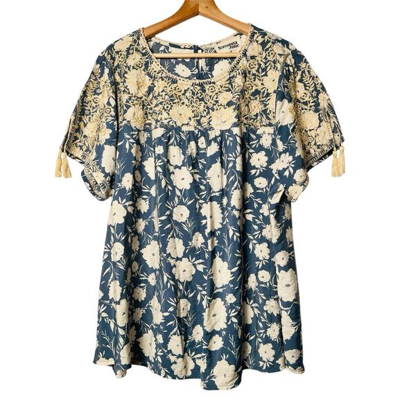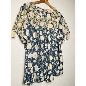 Savanna Jane 2X Embroidered Boho Peasant Top Blue Floral Tassel Sleeve Tunic