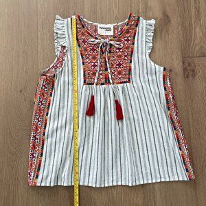 Striped short flutter sleeves with ruffles, babydoll fit top, tassel ties, split neckline, non sheer. Embroidered details on the front, back and sides.
