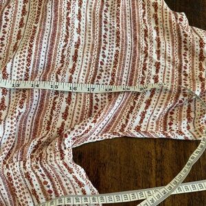 Nice preowned condition, no flaws to note. Surplice front blouse with elastic waistband and a tiered bottom hem. Rust and cream stripe pattern with tonal floral embroidery. Dolman style sleeves with elastic at cuff.