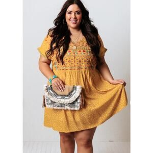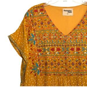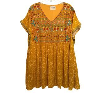 Savanna Jane Embroidered Dress Womens Size 2X Mustard Polka Dot Boho Tribal