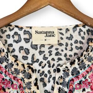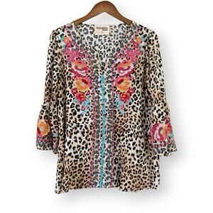 Savanna Jane Leopard Print Floral Embroidered V-Neck Bell Sleeve Tunic Size M