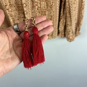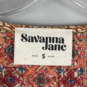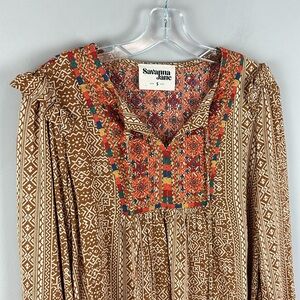 Savanna Jane geometric design peasant top with tie and tassels. Long sleeve.