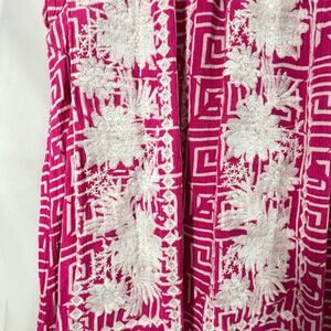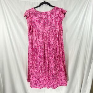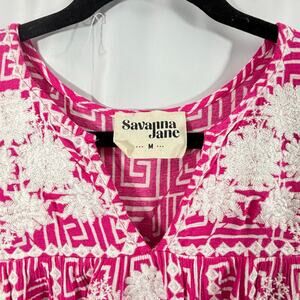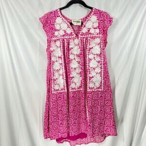 Bright and bold Savanna Jane boho dress (Size Medium) featuring a vivid pink geometric print with intricate white floral embroidery on the front. Flowy shift silhouette with cap sleeves and a relaxed fit — perfect for warm-weather styling, vacation wear, or casual everyday chic.