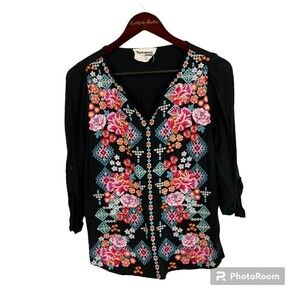 Savanna Jane S Women Top Floral Top Shirt Blouse Embroidered Roll Tab Sleeve T3