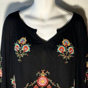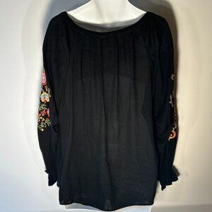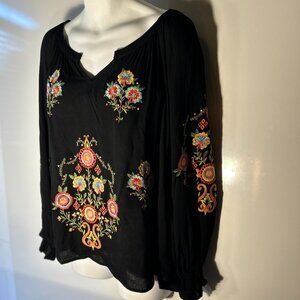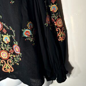 Black top with heavily bright embroidered floral details down front and sleeves